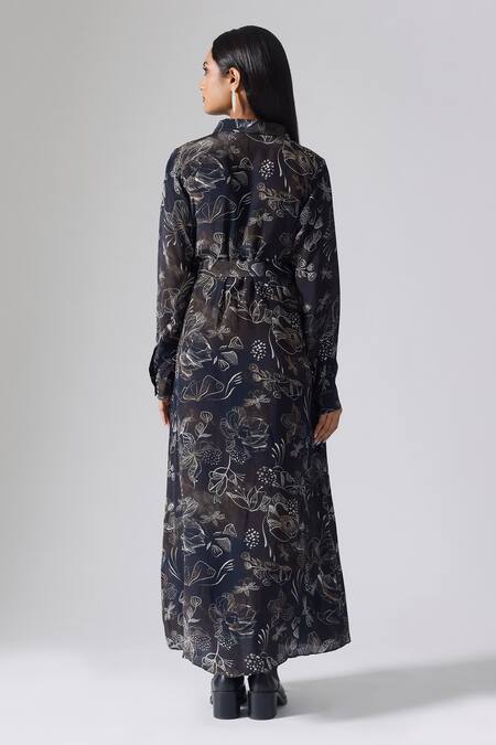 Buy_Klad_Black Crepe Printed Floral Collared Neck Front-open Maxi Dress With Belt_at_Aza_Fashions