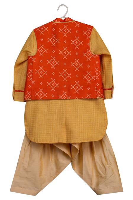 Orange jacket with bandhej print paired with yellow pathani & patiala.
