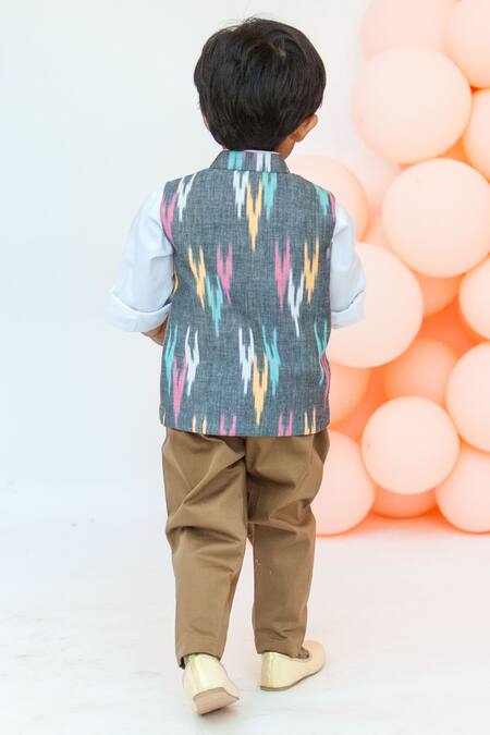 Multi color ikkat printed nehru jacket. Comes with white shirt & brown trouser pants.