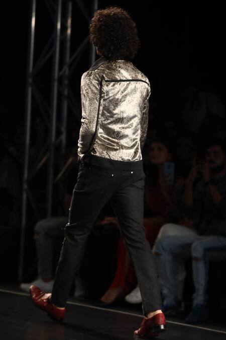 Buy_Manoviraj Khosla_Grey Velvet Printed Jacket_at_Aza_Fashions