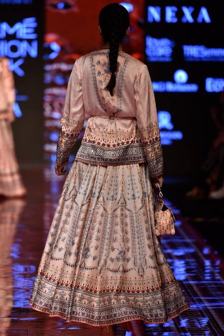 Peach front open jacket with floral printed motifs & sequin embellishment.