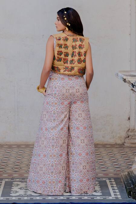 White jumpsuit with all over Persian carpet pattern print, sweetheart neck & side pockets. Paired with rust jacket with beads, zari dori & metal sequin work.
