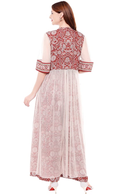 Maroon jumpsuit with all-over floral printed motifs & smocked yoke. Comes with net jacket.
