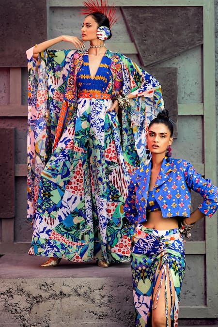 Multi Color Georgette, Cotton Silk Aztec Kaftan Open Printed Jumpsuit With