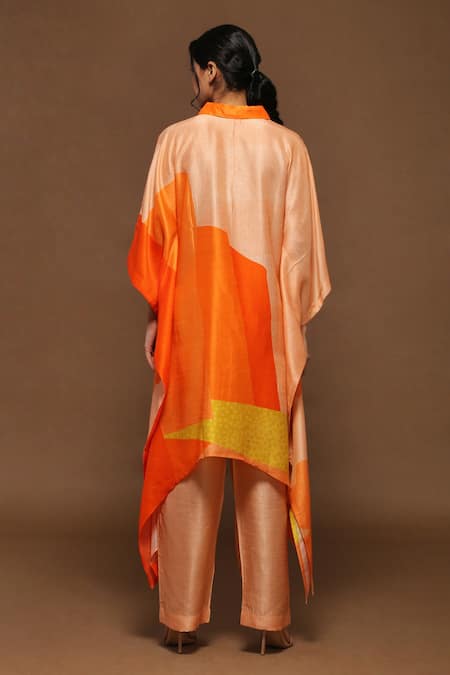 Orange Dupion Silk Floral Print Collared Neck Kaftan Kurta And Pant Set