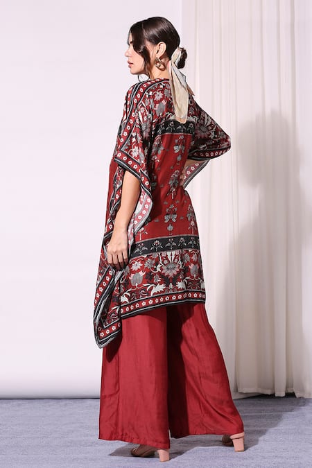 Merlot red kaftan top with all-over printed motifs. Comes with noodle strap jumpsuit.