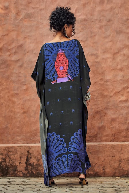 Nautanky_Black Crepe V Neck Printed Kaftan _Online_at_Aza_Fashions