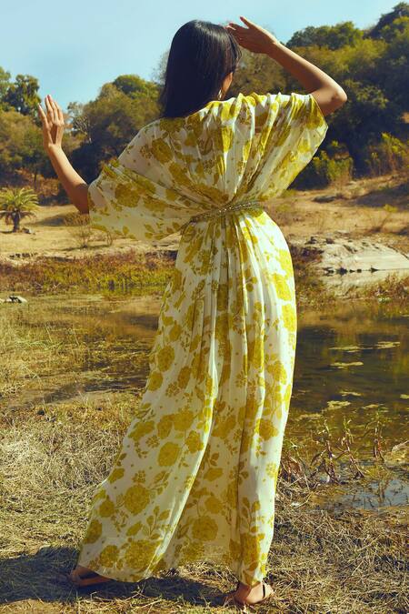 Off white, green kaftan with floral, bird printed motifs, embroidered neckline & flared sleeves. Paired with embroidered belt.