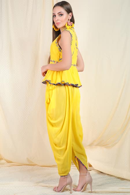 Yellow peplum style kurta with floral printed motifs & sequin embellishments. Comes with yellow dhoti pants & blue chiffon scarf.