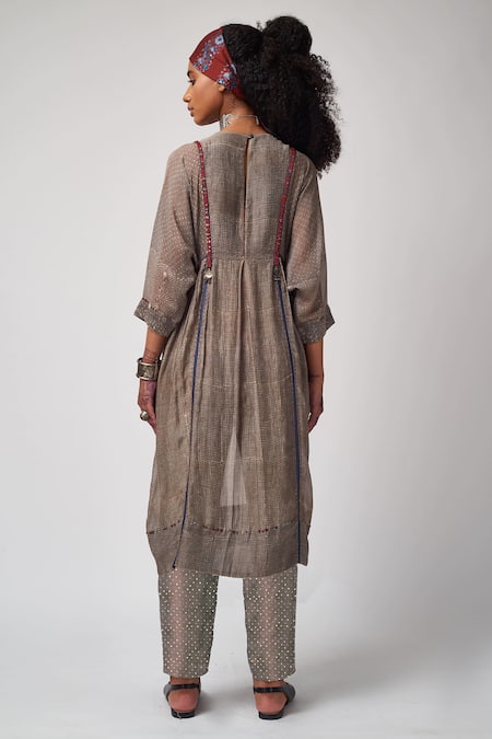 Grey kurta with printed motifs. Comes with straight pant.