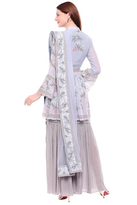 Buy_Soup By Sougat Paul_Blue Net, Crepe Band Printed Kurta Sharara Set _Online_at_Aza_Fashions