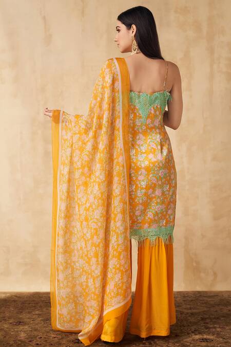 Yellow kurta with floral print pattern. Paired with sharara & dupatta.