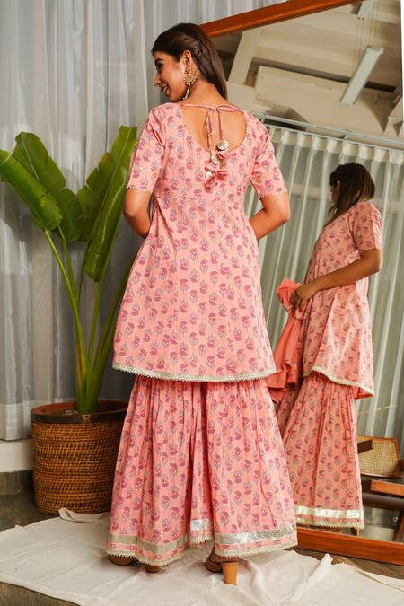 Peach kurta with floral print & gota work on placket. Paired with sharara & dupatta.