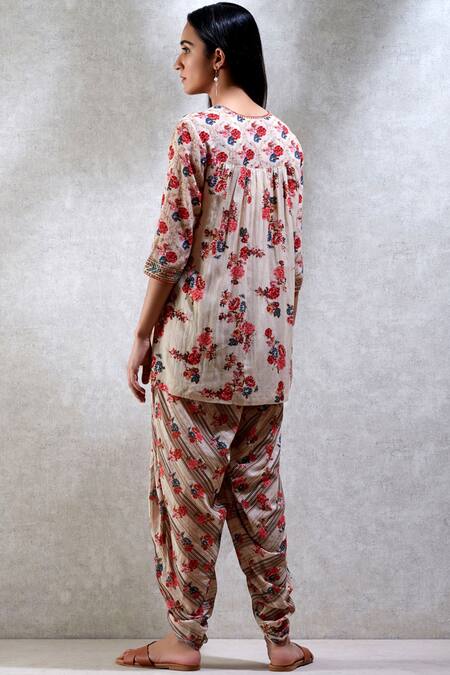 Ecru flared kurta with floral printed motifs & embroidered yoke. Comes with printed dhoti pants.