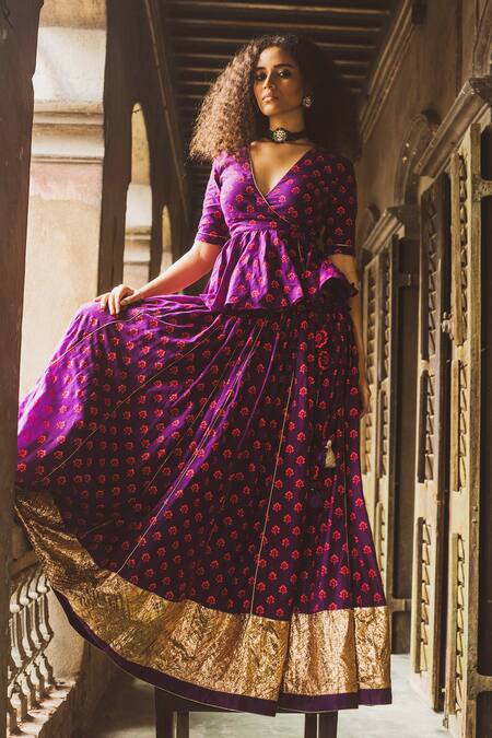 Purple cotton mal printed lehenga with lampi border. Paired with a peplum style blouse and a contrast yellow organza silk, resham embroidered dupatta.