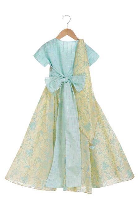 Blue checkered wrap blouse with big bow front & back. Comes with yellow all over floral printed lehenga & dupatta.