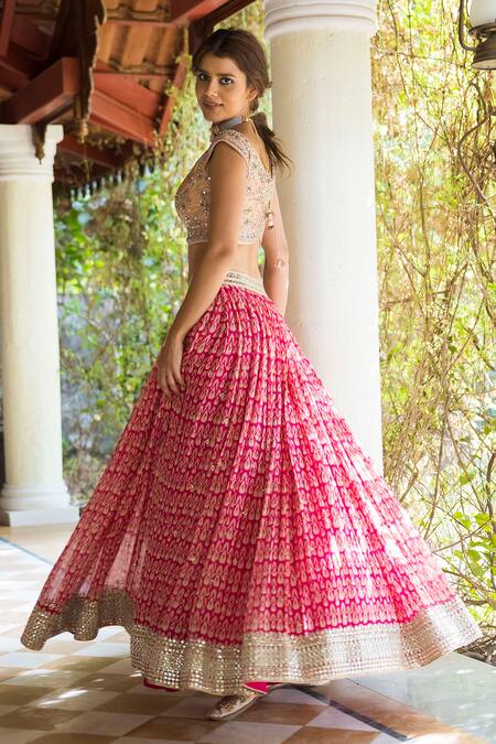 Pink Georgette Leaf Neck Printed Lehenga Set