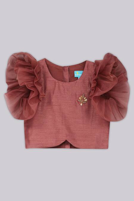Placement floral embroidery on top, Lace border detailing on lehenga, Flounce sleeves for added volume