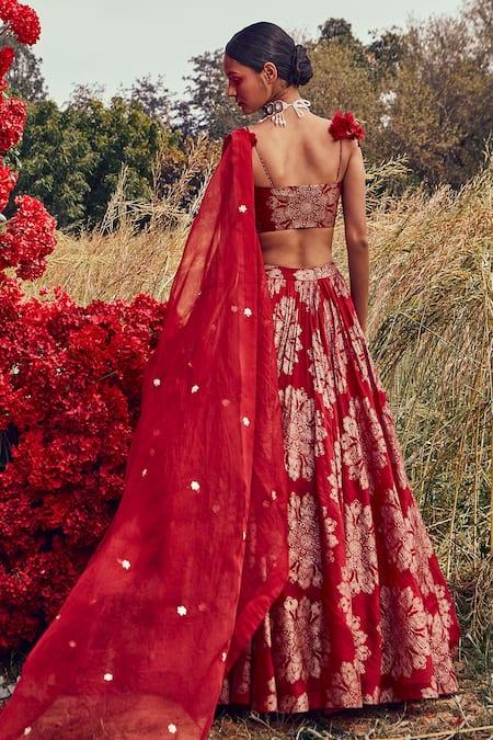 Red organza lehenga with all-over tara print. Comes with a coordinating blouse and embroidered dupatta.