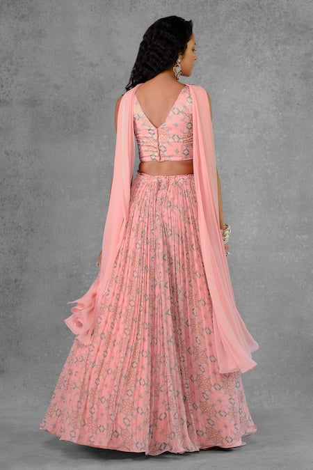 Buy_Riraan Couture_Pink Cotton Satin, Georgette, Rayon Embroidery, Beads V-neck Printed Lehenga Set_Online_at_Aza_Fashions