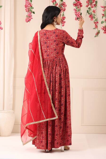 Red floral printed Anarkali featuring a V-neckline and churi sleeves. Paired with a semi-sheer organza dupatta with lace trims.