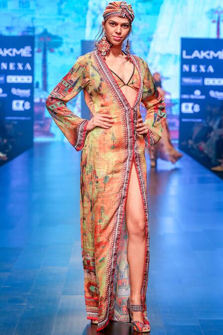 Printed, embellished, Flared sleeves, Front slit, Note:, Bikini top & head accessory worn by the model is not for sale