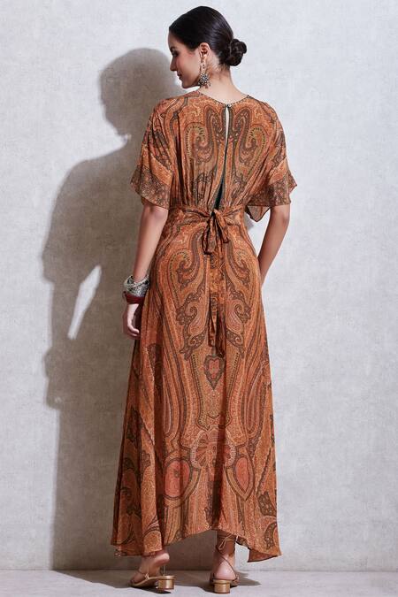 Kaftan & overlap pattern bodice, Cinched waist, Asymmetric hem, Flared silhouette, Back tie up detail