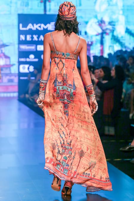 Printed, embellished, Pleated bodice, Adjustable shoulder straps, Bead embellished hem, Front slit, Note:, Head accessory worn by the model is not for sale