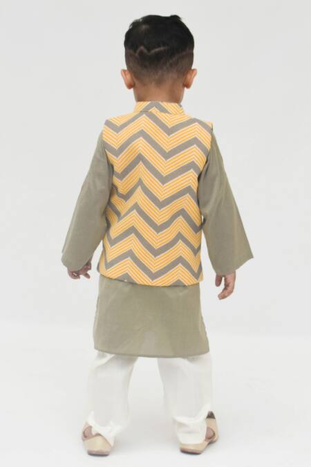 Yellow and grey Nehru jacket featuring a chevron print and welt pocket. Paired with a grey kurta and pants with a semi-elasticated waistband and side slits.