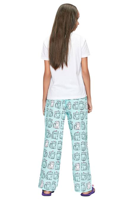 White T-shirt with cat printed motif. Comes with green printed pyjama.