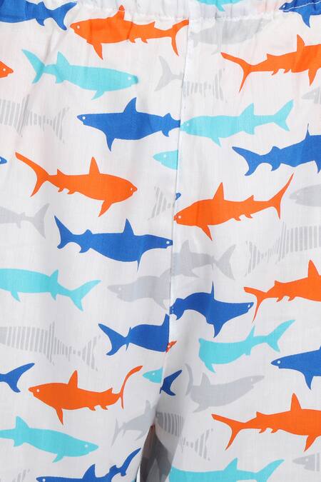 Blue T-shirt with multi color shark printed motif. Comes with white printed pyjama.