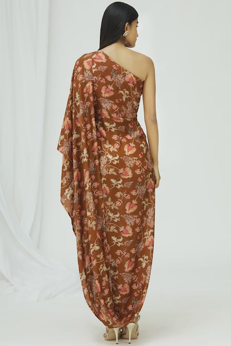 Brown Cotton Silk Asymmetric Printed One Shoulder Cowl Dress