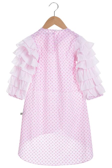 Layered ruffle sleeves pink hued printed dress. Enhanced with bead details on neckline.
