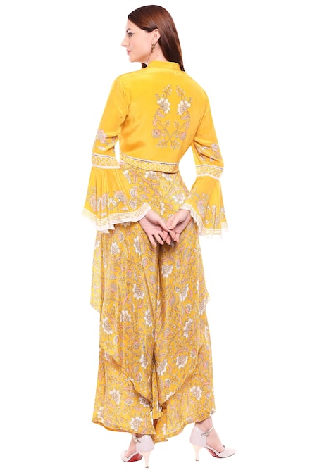 Yellow jacket style top with all-over floral printed motifs & sequin embellishments. Comes with layered pants.