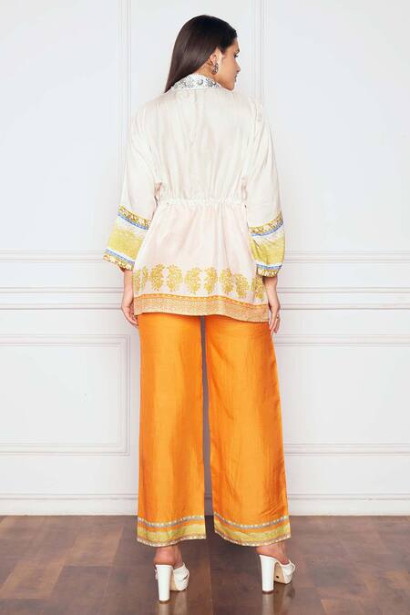 Ivory peplum kaftan featuring a lapel collar, floral print, and sequin & resham work. Paired with straight fit orange pants with printed borders.
