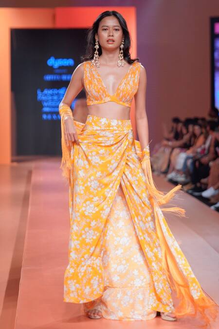 White and orange floral printed blouse featuring a V neck and sleeveless design. Paired with a tulip skirt and fringe tassel bordered dupatta.