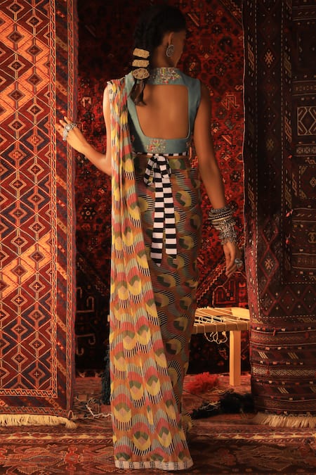 Buy_Qbik_Multi Color Saree- Silk Chiffon Square Neck Printed Pre-stitched With Blouse_Online_at_Aza_Fashions