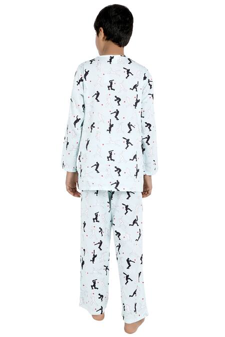 Blue shirt with all over cricket printed motifs. Comes with pyjama.