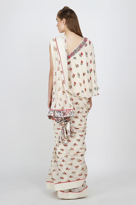 Ivory saree with all-over floral print. Paired with one shoulder blouse.