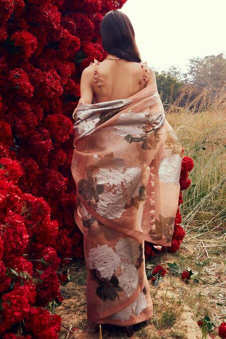 Buy_Bhumika Sharma_Peach Organza, Net, Satin Crepe And Shantoon Dahlia Print, Saree With Blouse_at_Aza_Fashions