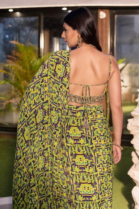 Green pre-draped saree with all-over zigzag print. Comes with embroidered blouse.