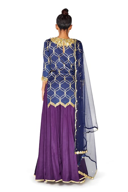 Navy blue straight short kurta with cutwork at the hemline teamed with purple kali palazzo pants. Comes with scallop net dupatta with sequins chitta all over