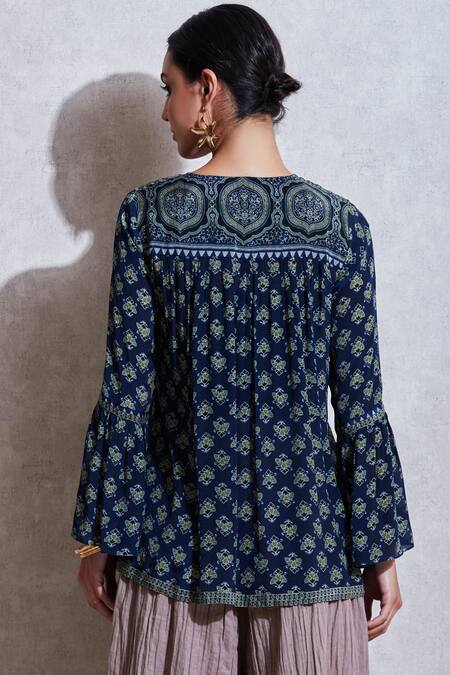 Yoke with thread embroidery & mirror work, Bell sleeves, Gathered front, Front tie up, Note:, Pant worn by the model is not for sale
