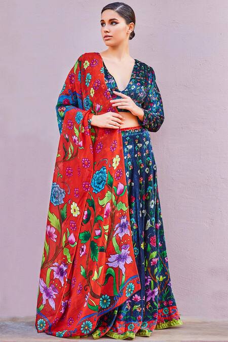 Blue lehenga with all-over floral & leaf motif work. Comes with plunging neckline blouse & printed red dupatta.