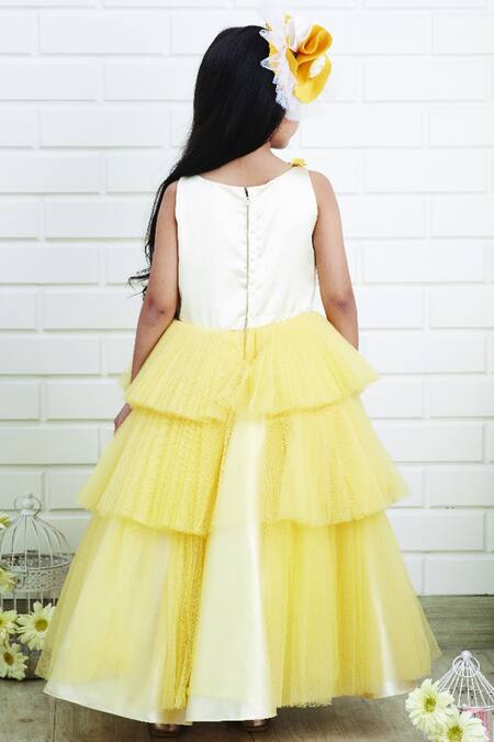 Yellow gown with floral printed motifs & tiered net sides.