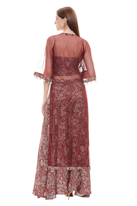 Maroon sheer net tunic with placement print paired with sleeveless crop top. This set comes with floral motif worked flared pants.