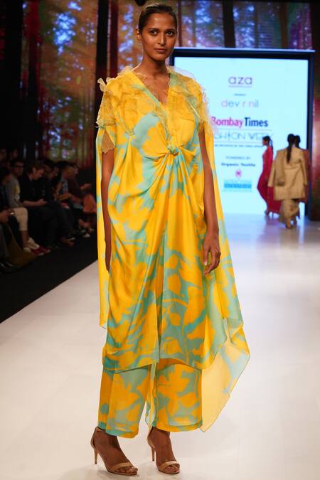 Buy_Dev R Nil_Yellow Satin Organza V Neck Printed Tunic Pant Set_at_Aza_Fashions