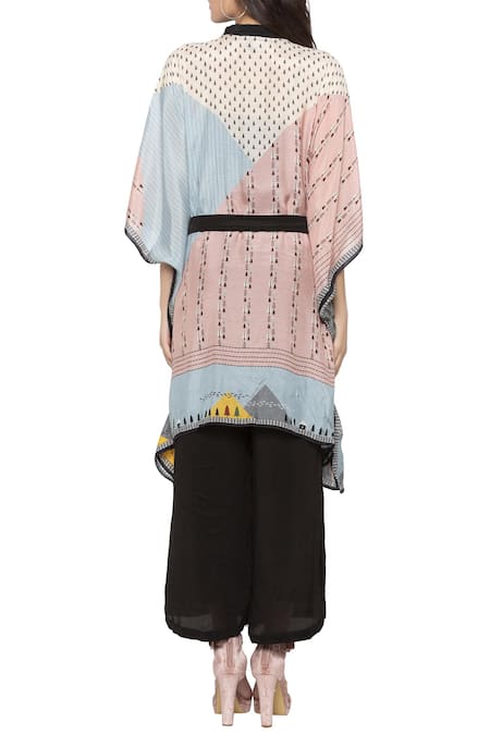 Multicolor hued all over printed kaftan tunic. Comes with a belt.