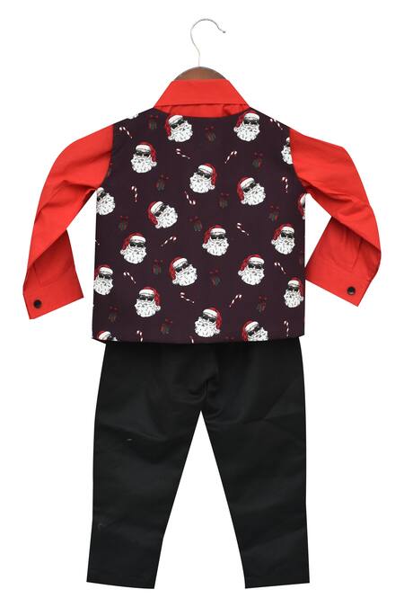 Showcasing a Santa Claus printed brown waist coat. Coordinated with a red shirt and black pants and crafted out of luxe fabrics, this set -of-three ensures your adorable son looks cute as a button.