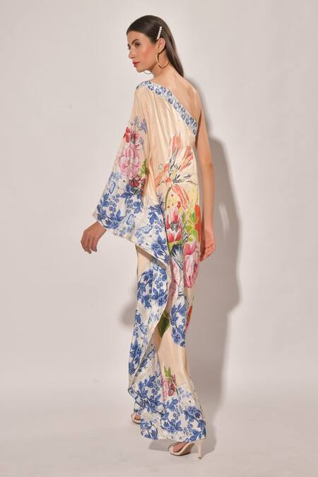 Beige pure silk kaftan, featuring one shoulder hem and multi color floral prints, with pearl embellished neckline.